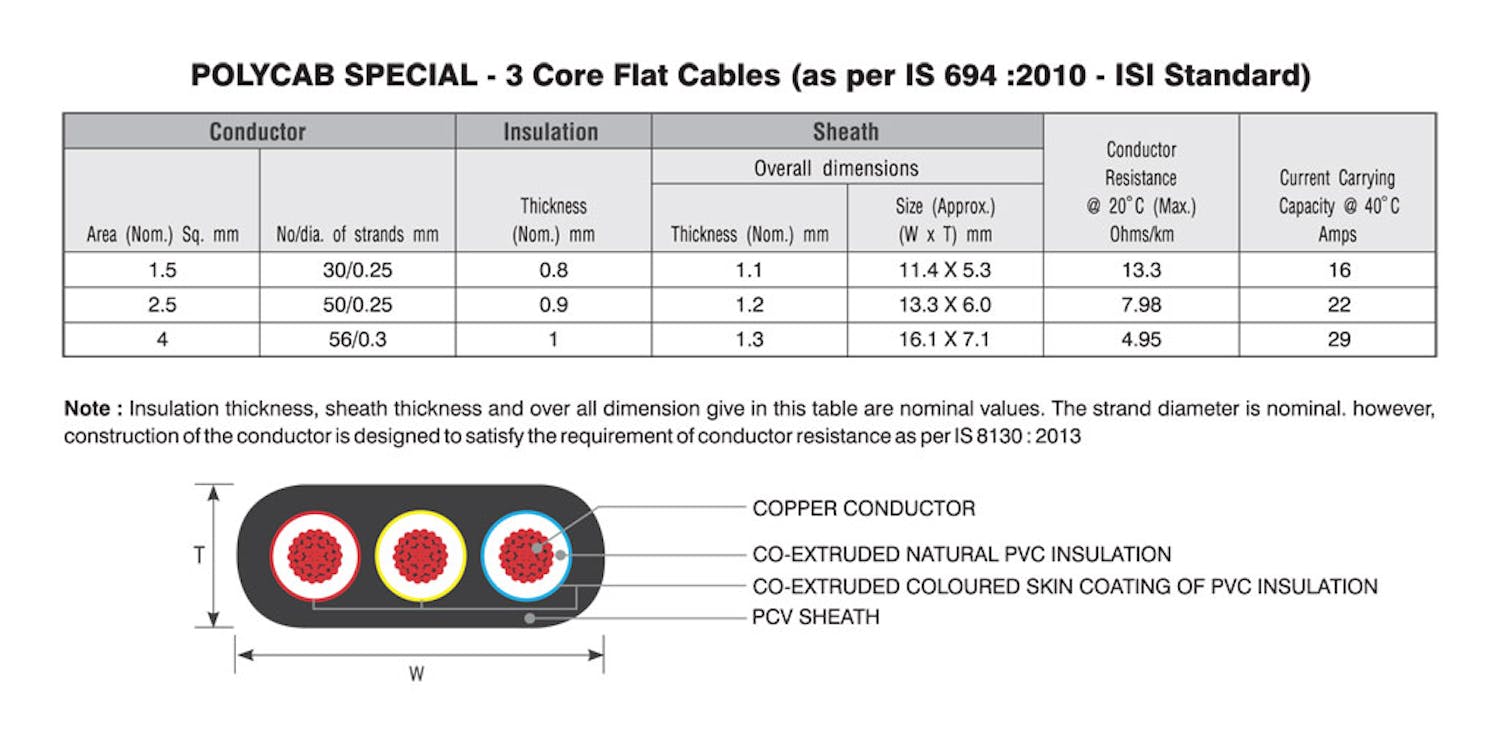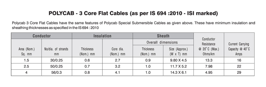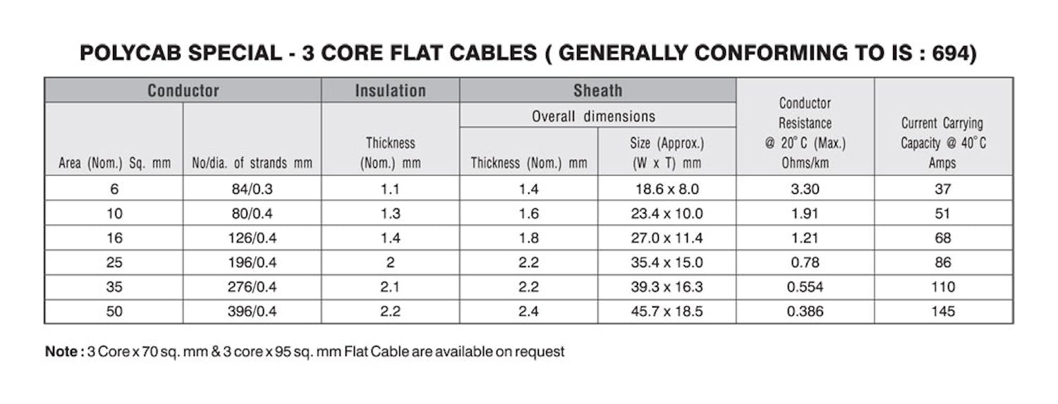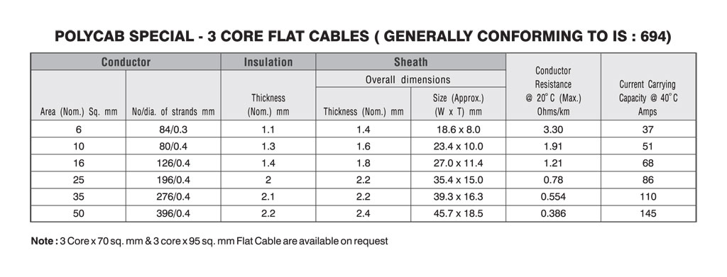 Polycab Special 3 Core Flat Cables are manufactured for critical space requirement, protection against indefinite immersion in water under specified conditions, protection against rain-water and against ingress of small solid foreign bodies.