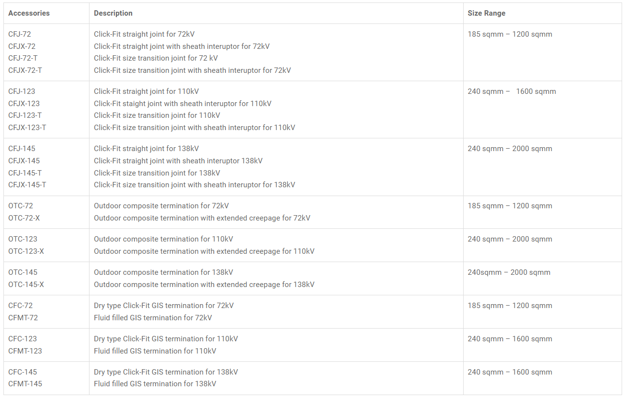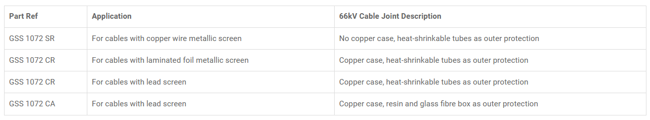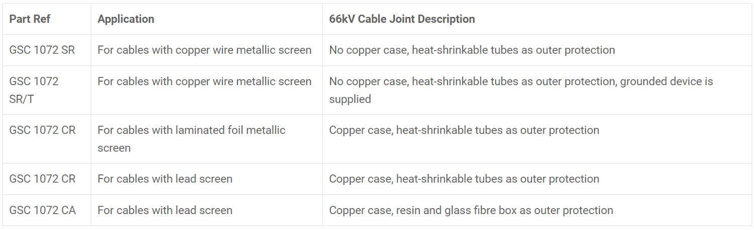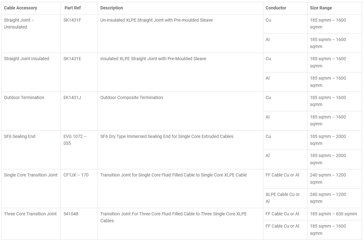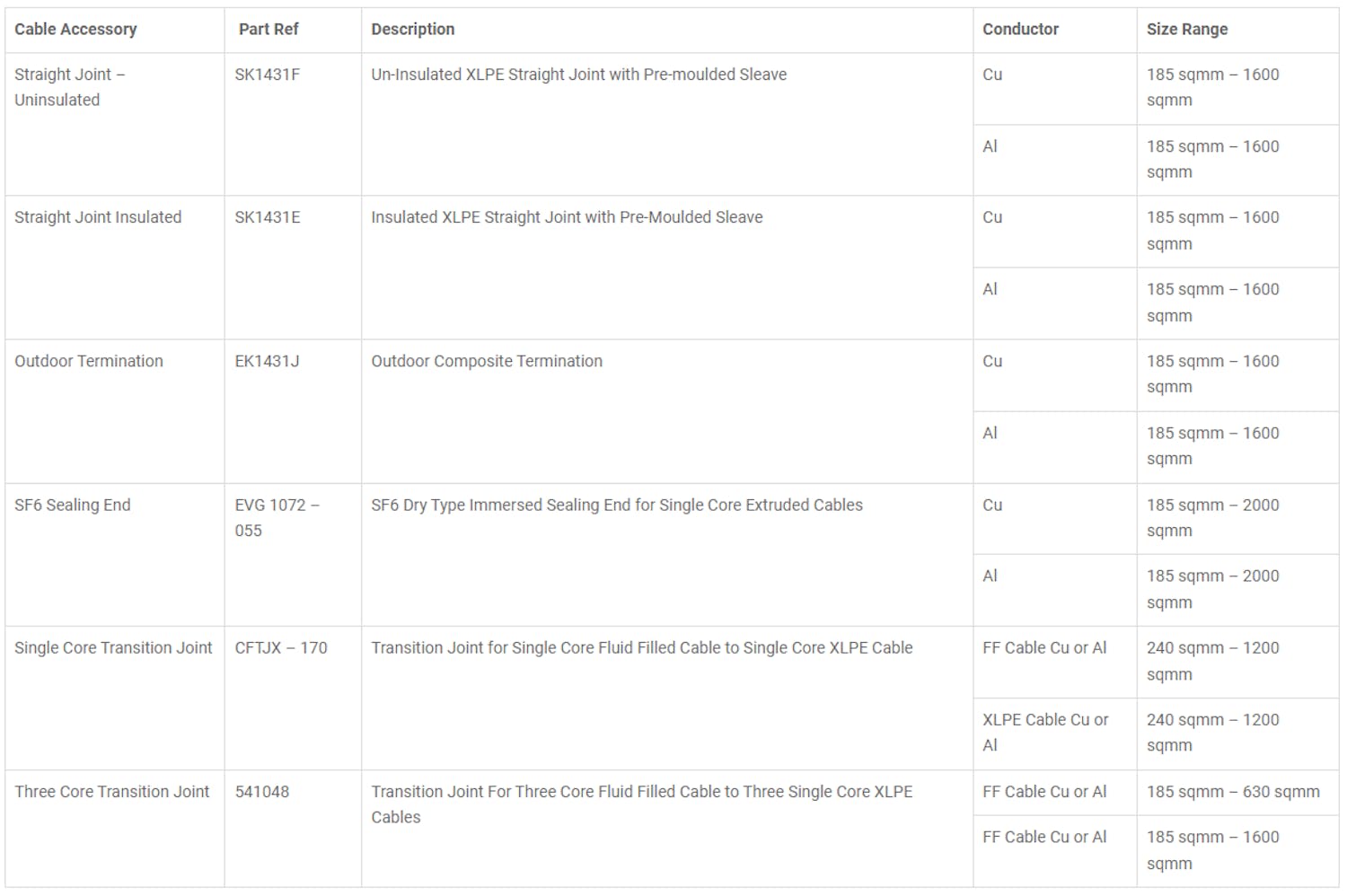 66kV straight cable joints, cable terminations and sealing ends are designed in accordance with IEC6084 and with either an aluminium foil laminate or welded metallic sheath on request.