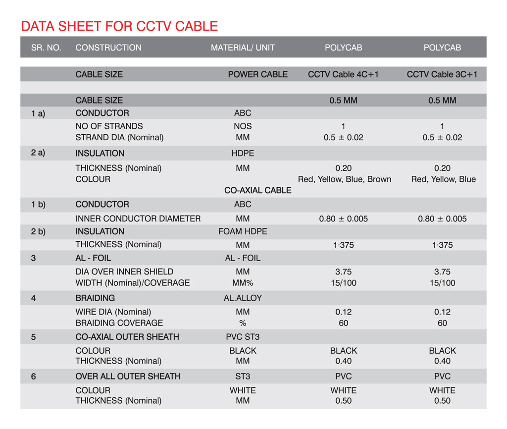 POLYCAB CCTV Cables are offered in two types namely 4+1 CCTV Cable and 3+ 1CCTV Cable.Coaxial cables form the carrier for video signal and the other ‘4cores’ or ‘3 cores’ form the carriers for power. Coaxial cables are designed to transmit the complete video frequency range with minimum distortion or attenuation, making the man excellent choice for CCTV.Polycab CCTV cables are designed to optimize the quality of video signals, which are transmitted through the Coaxial cable in the CCTV cable. The Coaxial cable consists of solid annealed bare copper conductor of electrolytic grade which is insulated with foamed dielectric.