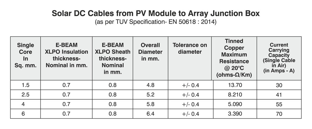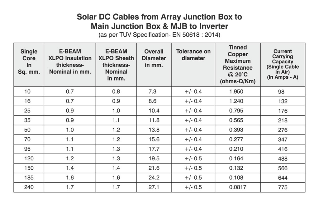 Technical Specification Construction: Conductor: tinned copper conductor IEC60228, Class5. Insulation/sheath: electron beam cross linked halogen free & flame retardant compound (XLPO). Electrical: Voltagetest: 6500V as per EN50395. Max permissible operating voltage: DC 1.5Kv (conductor-conductor,non earthed system). Nominal voltage: AC-0.6/1Kv, DC-900/1.5Kv. Temperature: Ambient Temperature: -40°C to +90°C. Max conductor temperature: 40°C to 120° Max bending radius: 5 *OD(fixed installation) 15 *OD(occasional moved) Standards / Material Properties: Fire performance: IEC 60332-1-2 Smoke emission: IEC 61034 / EN 50268-2 Halogen free: EN 50267-2-1/-2,IEC 60754-2 Toxicity: EN 50305, ITC-index<3 Ozone Resistant: EN 50396 Weathering UV: HD 605/ A1 or DIN 53367 Approvals: EN 50618; H1Z2Z2-K Product Enquiry